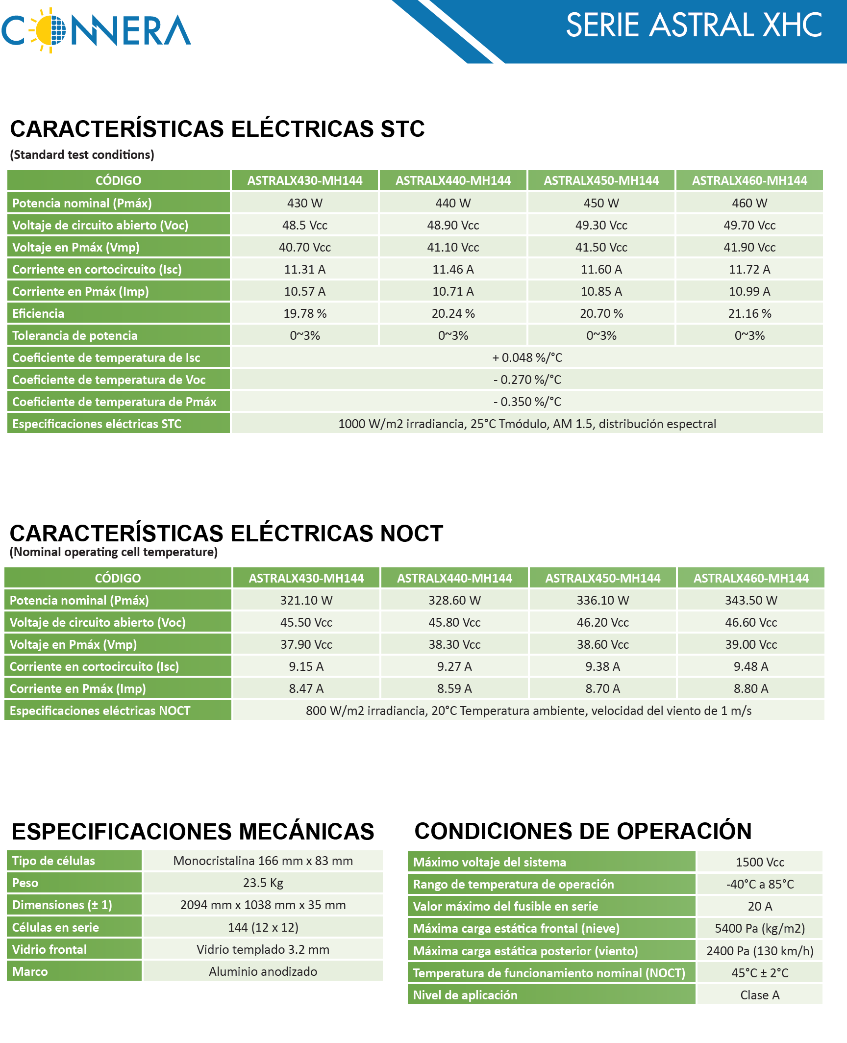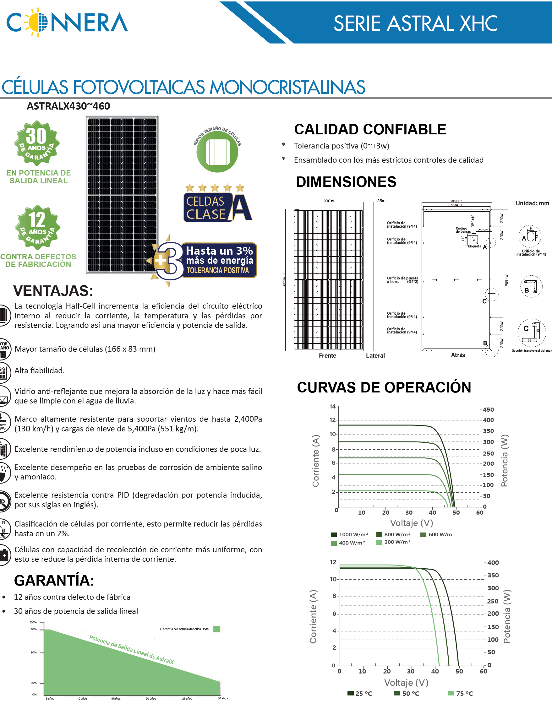 Nota: Las especificaciones eléctricas se indican bajo una irradiancia de 1000 W/ m2 y temperatura de 25 ºC.