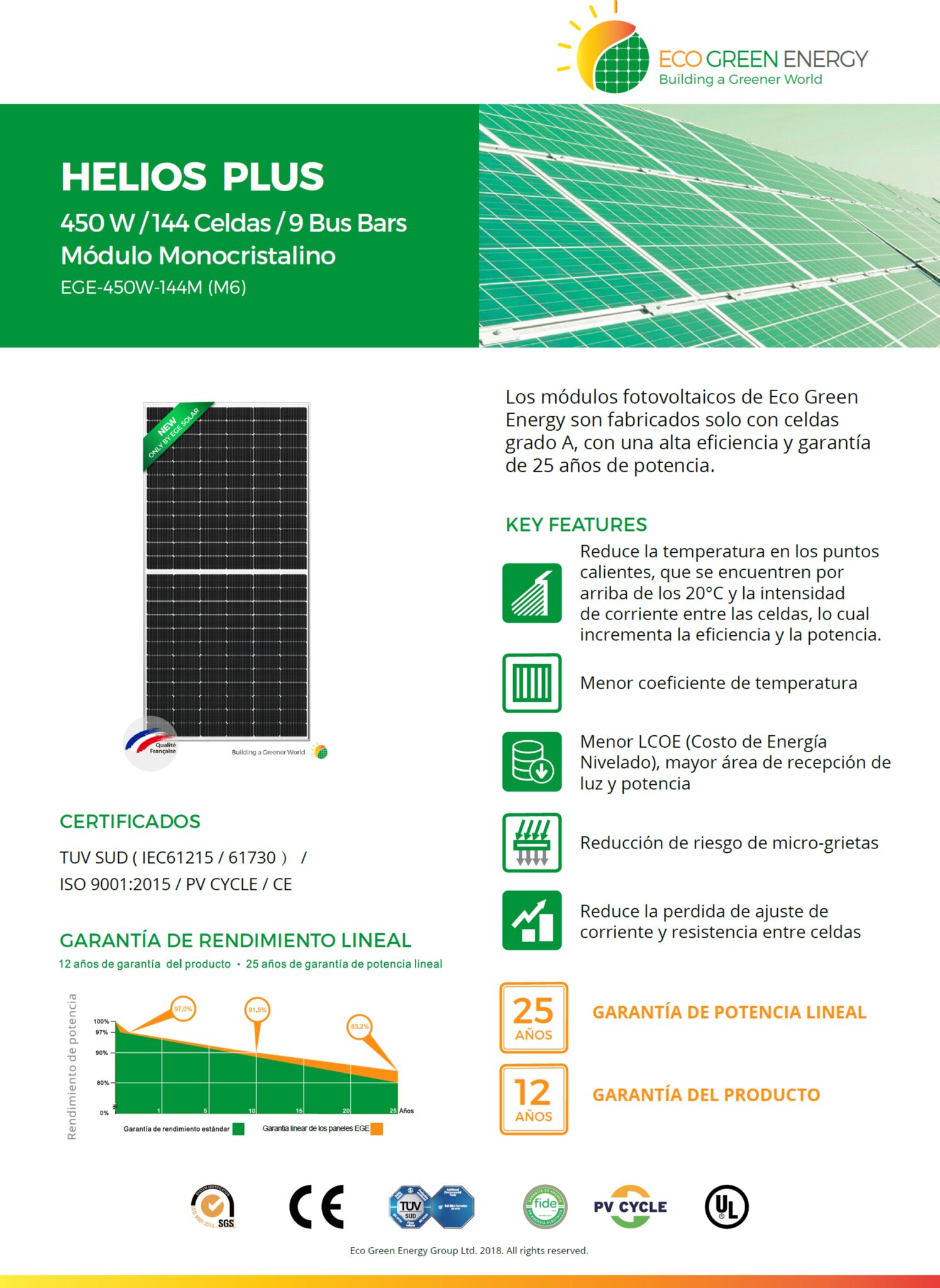 Los módulos fotovoltaicos de Eco Green Energy son fabricados solo con celdas grado A, con una alta eficiencia y garantía de 25 años de potencia lineal.
