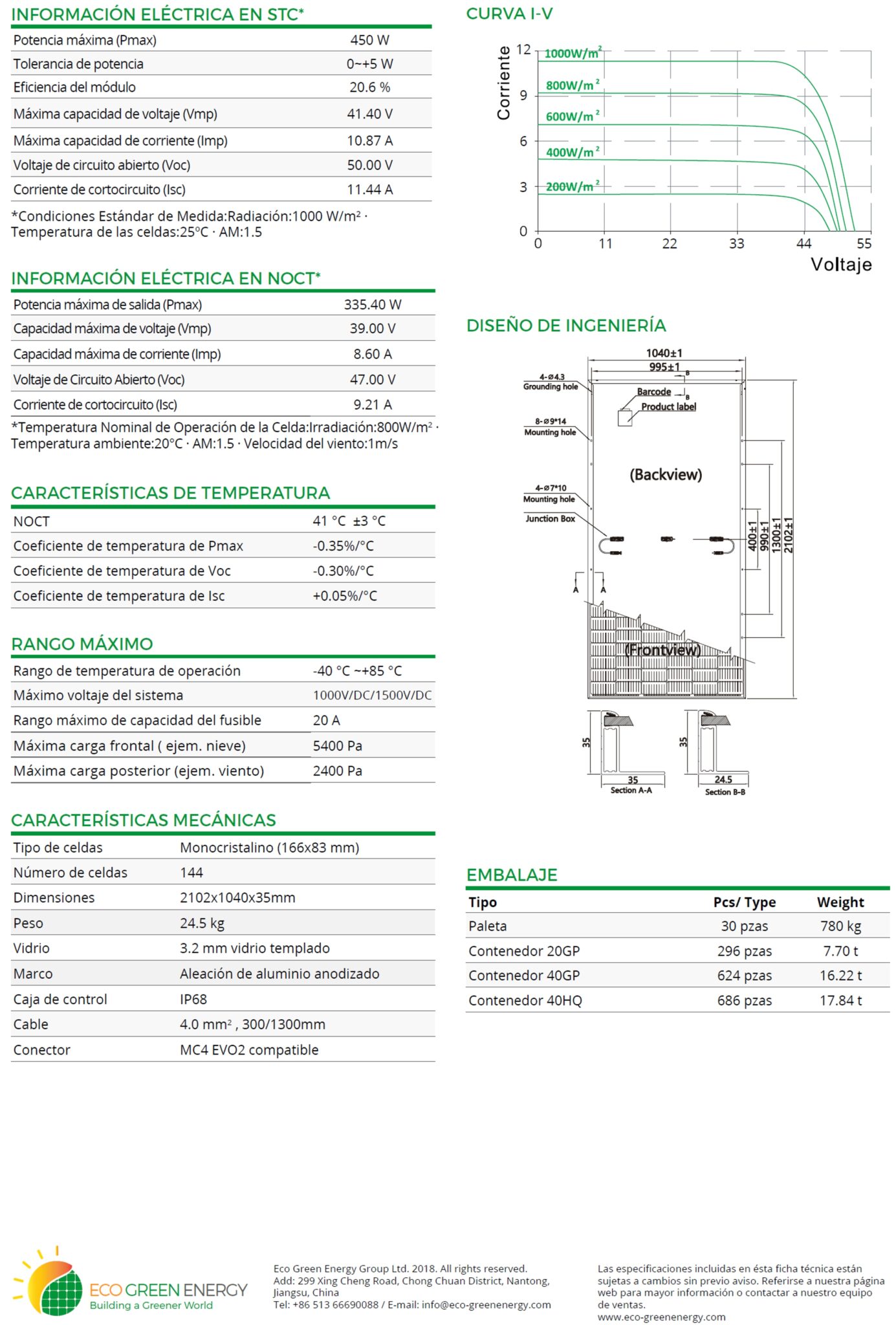 Panel solar 450W monocristalino – 144 Celdas / 9 Bus bars – ECO GREEN ENERGY
