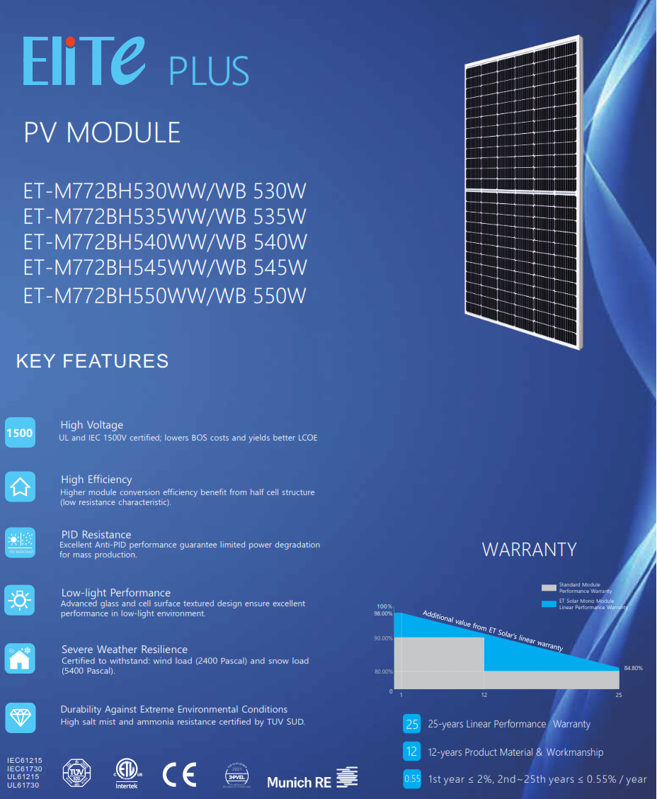 Elija el módulo PV ET-M772BH550WW/WB de 550W para garantizar el máximo rendimiento y durabilidad en su próximo proyecto de energía solar.