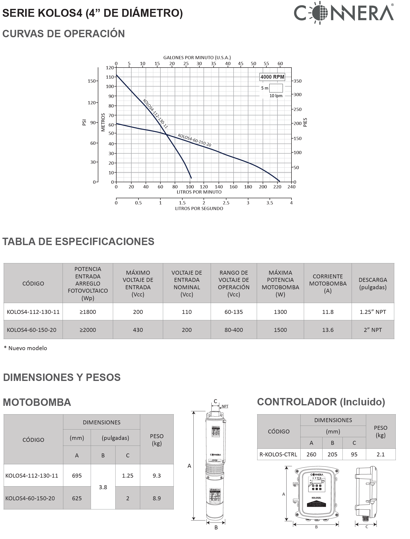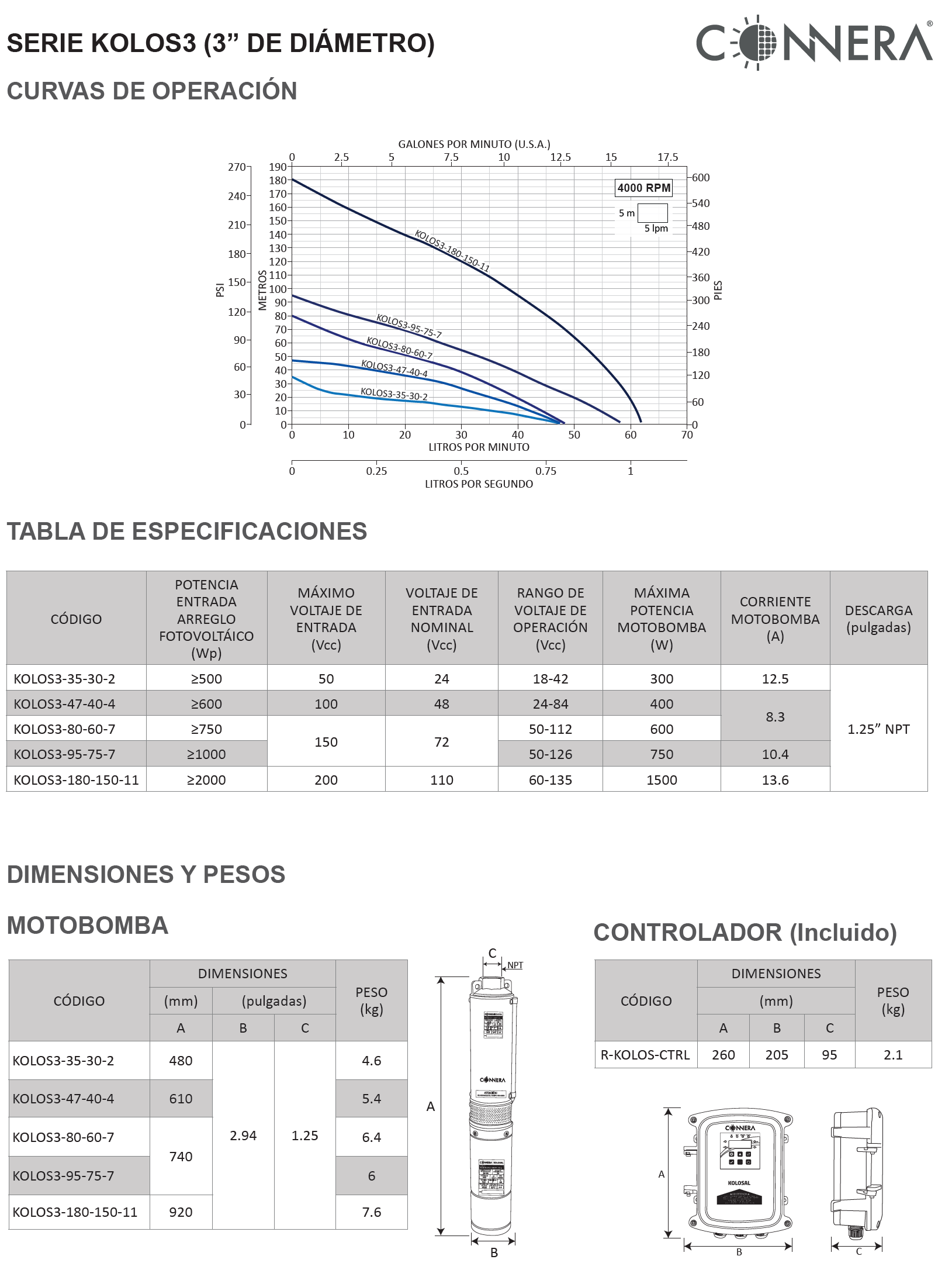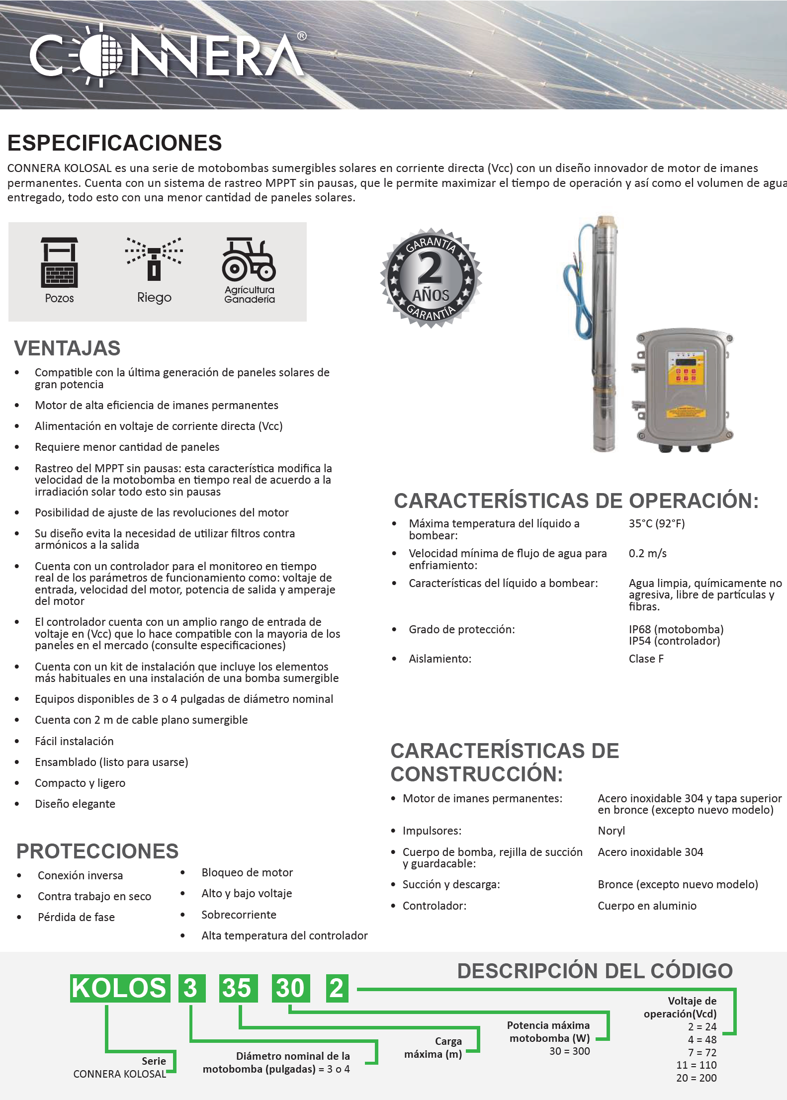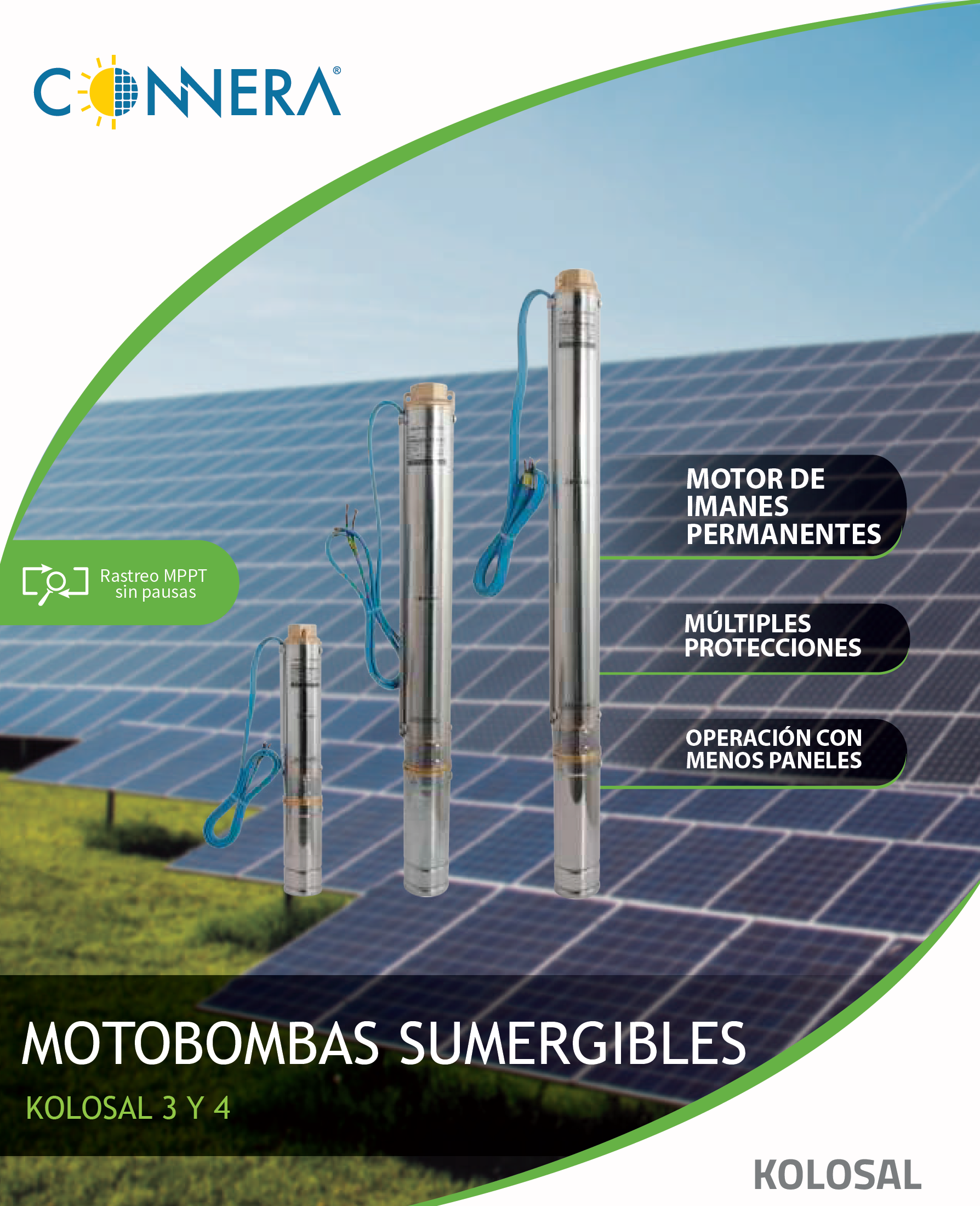 CONNERA KOLOSAL es una serie de motobombas sumergibles solares en corriente directa (Vcd) con un diseño innovador de motor de imanes permanentes. Cuenta con un sistema de rastreo MPPT sin pausas, que le permite maximizar el tiempo de operación y así el volumen de agua entregado, todo esto con una menor cantidad de paneles solares.
