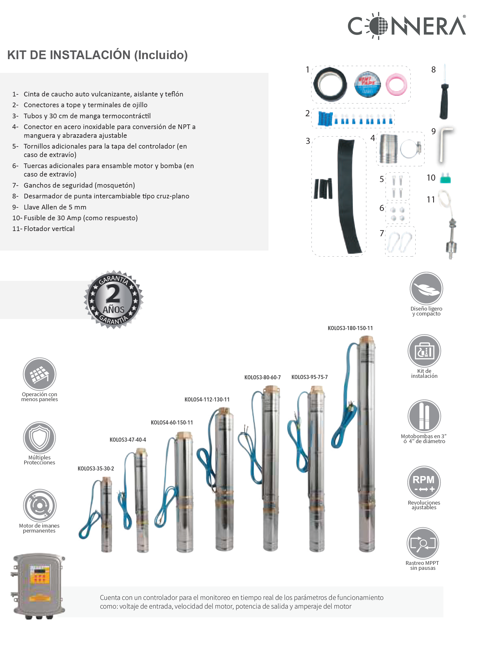 • Cuenta con un Kit de instalación que incluye los elementos más habituales en una instalación de una bomba sumergible.